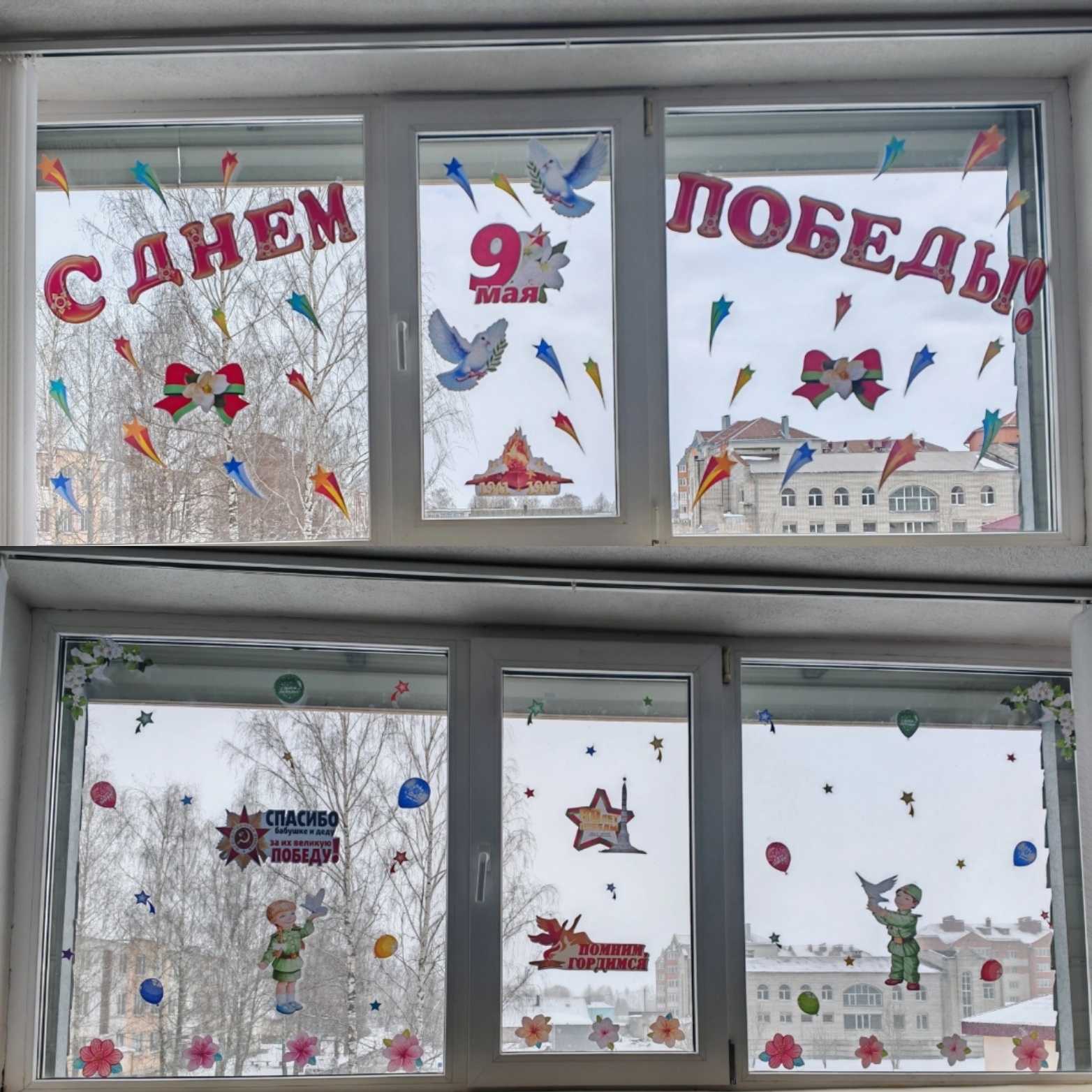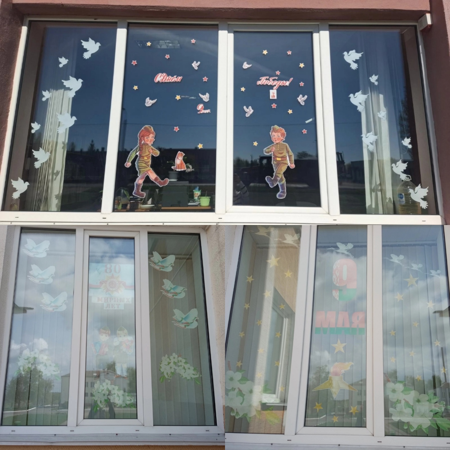 Празднично оформленные окна, с использованием рисунков, картинок, плакатов, баннеров, фотографий и надписей, посвящённых 80-летию Победы советского народа в Великой Отечественной войне, будут нашим напоминанием о мужестве, единстве и вечной благодарности за мирное небо.