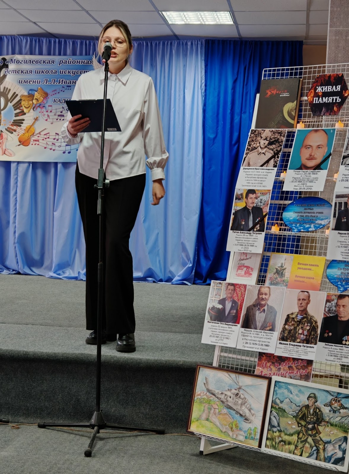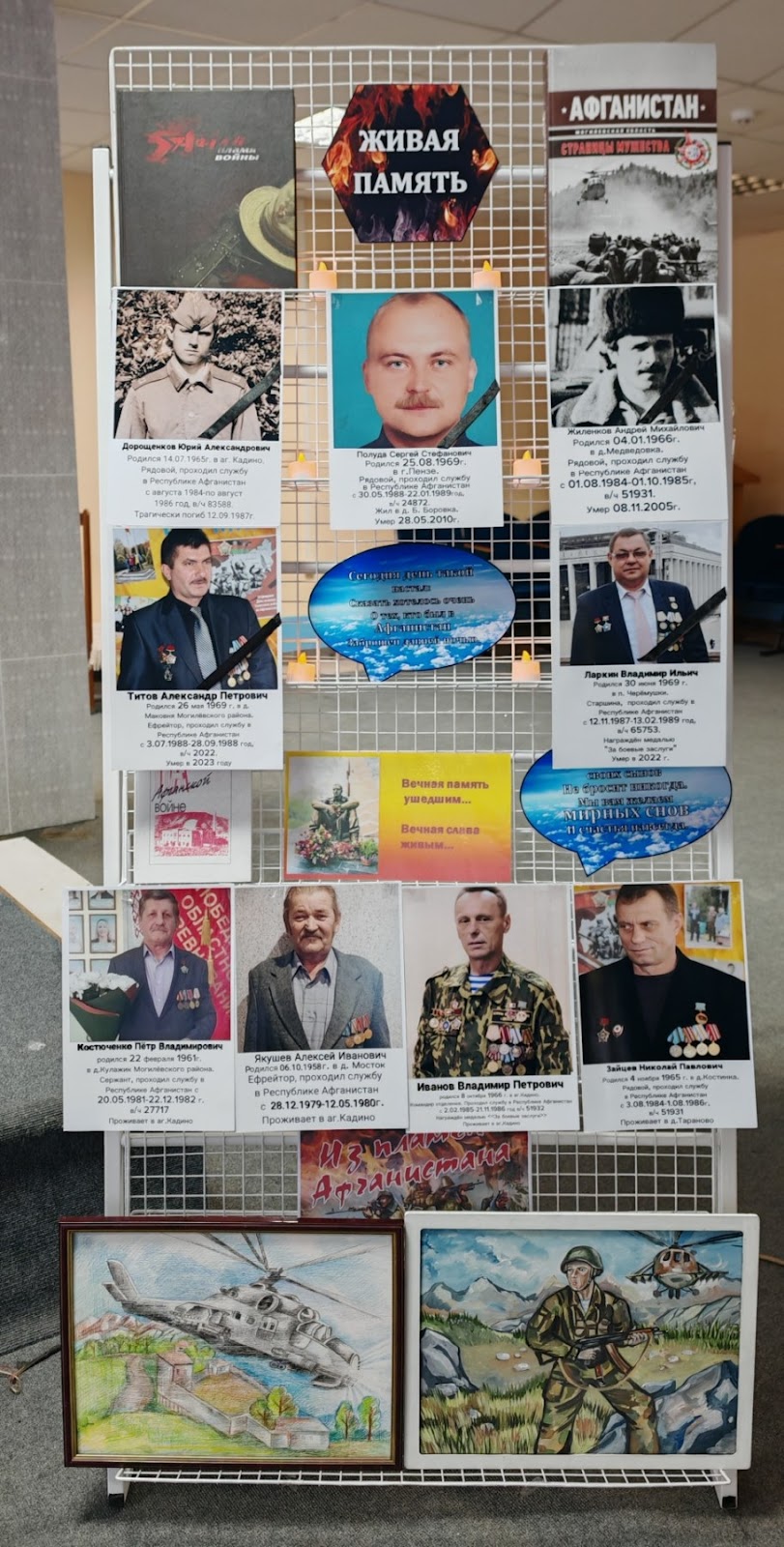 12 февраля сотрудники Кадинской сельской библиотеки, ГУО «Могилёвская районная детская школа искусств имени Л. Л.Иванова» Кадинский филиал и ГУДО «ЦТДиМ Могилёвского района» совместно провели вечер-портрет «Память с сединою на висках». В ходе мероприятия: музыкальные композиции и стихи об Афганской войне; рассказ ветеранов войны в Афганистане, младшего сержанта В.П.Иванова и ефрейтора А.И.Якушева, о том, как советские воины сохранили верность военной присяге, воинскому и человеческому долгу по охране южных границ СССР; обзор тематической выставки «Живая память»; минута молчания и вручение цветов Владимиру Петровичу и Алексею Ивановичу со словами благодарности за их подвиг, который они совершили, будучи ещё совсем молодыми.
