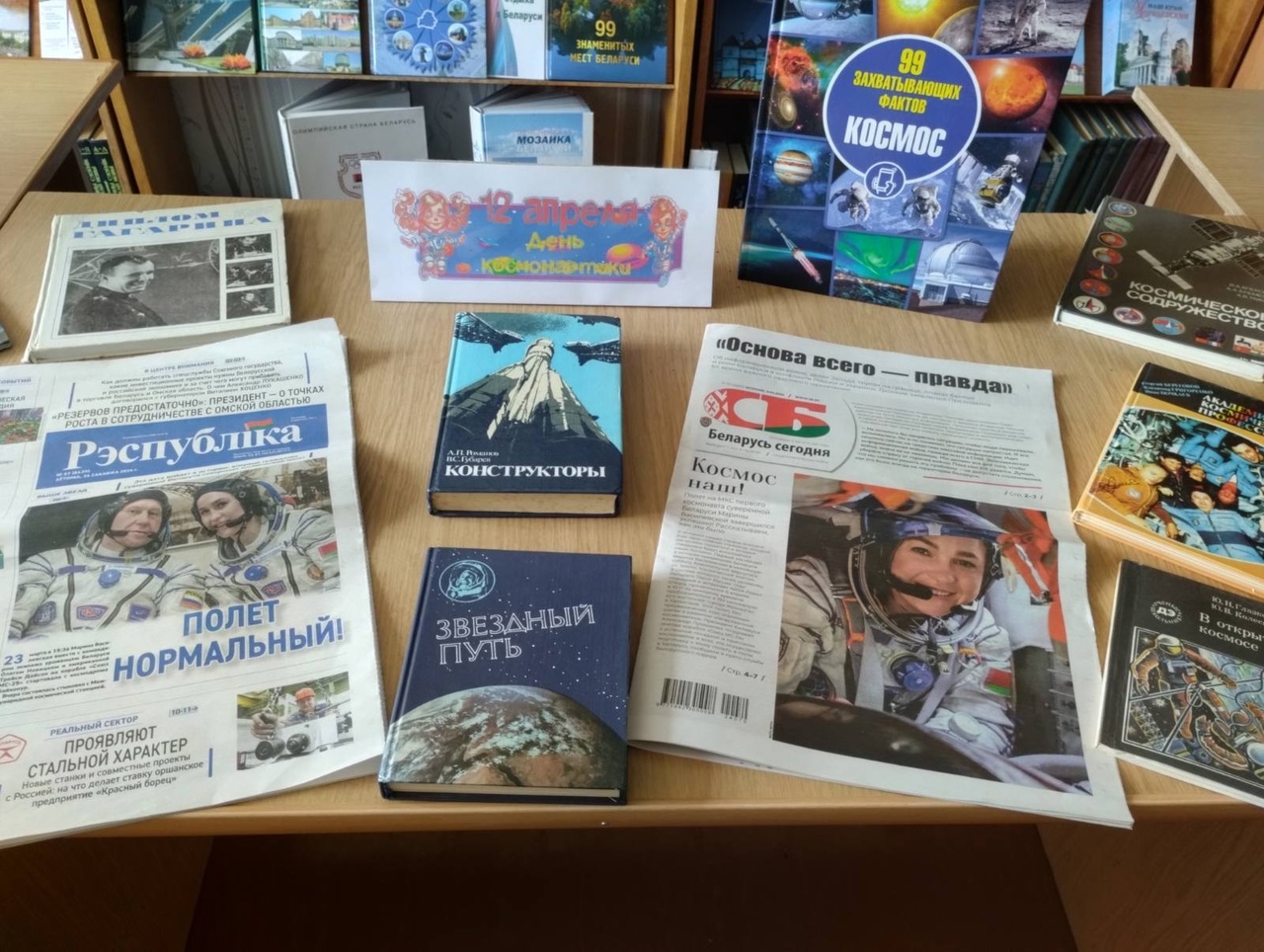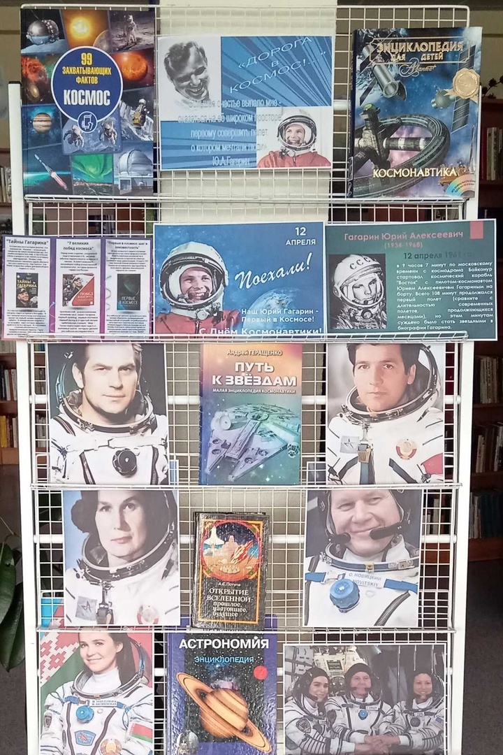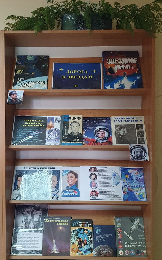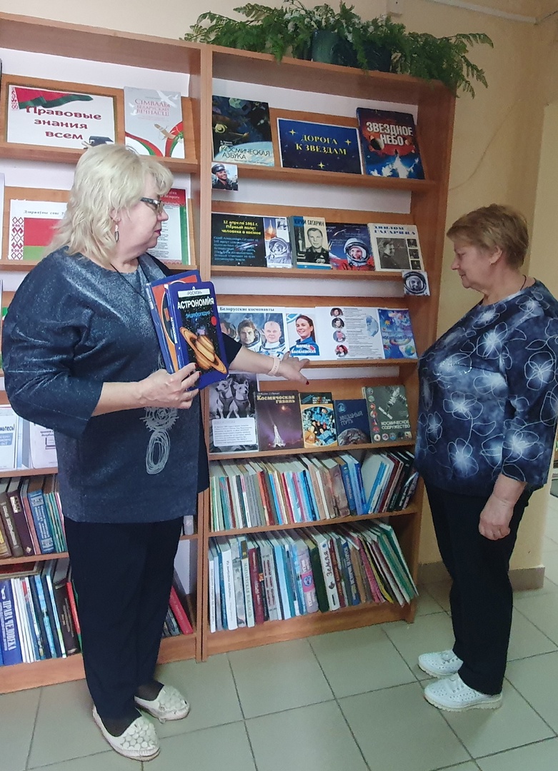 12 апреля в центральной библиотеке оформлена выставка-обзор «Дорога к звёздам». На которой представлены книги о космосе, об истории развития космической отрасли, которые интересны как детям, так и взрослым. А также библиотекарь знакомит читателей с уникальным событием для всех граждан Республики Беларусь – о полёте на Международную космическую станцию (МКС) первой женщины-космонавта Беларуси Марины Василевской. Марина Василевская стала первой гражданкой Беларуси, которая отправилась в космос. Её полёт начался 23 марта на корабле «Союз МС-25», он занял двое суток, стыковка с МКС прошла 25 марта. За время пребывания на МКС Василевской необходимо было провести ряд экспериментов. В том числе узнать, как штаммы пробиотиков молочнокислых микроорганизмов и бифидобактерий ведут себя в невесомости. Василевская, а также её дублер Анастасия Ленкова, согласно недавно принятому указу Президента Республики Беларуси, официально считаются белорусскими космонавтами. Также Марина Василевская удостоена звания Героя Беларуси.