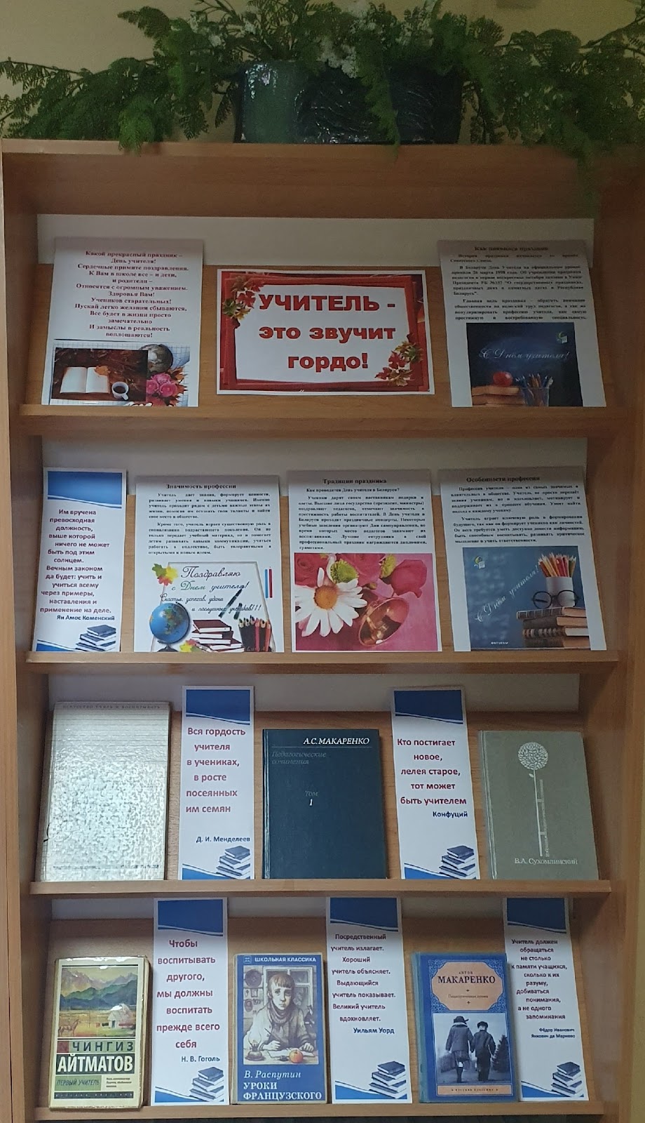 В преддверии Дня учителя в читальном зале центральной библиотеки организована тематическая выставка-поздравление «УЧИТЕЛЬ – это звучит гордо!» действующая с 04.10.2024 по 08.10.2024 года. Здесь представлены слова благодарности, поздравительные открытки и книжные издания известных педагогов: В.А.Сухомлинского, А.С.Макаренко, Д.И.Писарева и др. Также представлены художественные произведения, раскрывающие перед читателями образ учителя и ученика. Это такие книги как: «Первый учитель» Ч.Айтматова, «Педагогическая поэма» А.С.Макаренко, «Уроки французского» В.Распутина и другие.