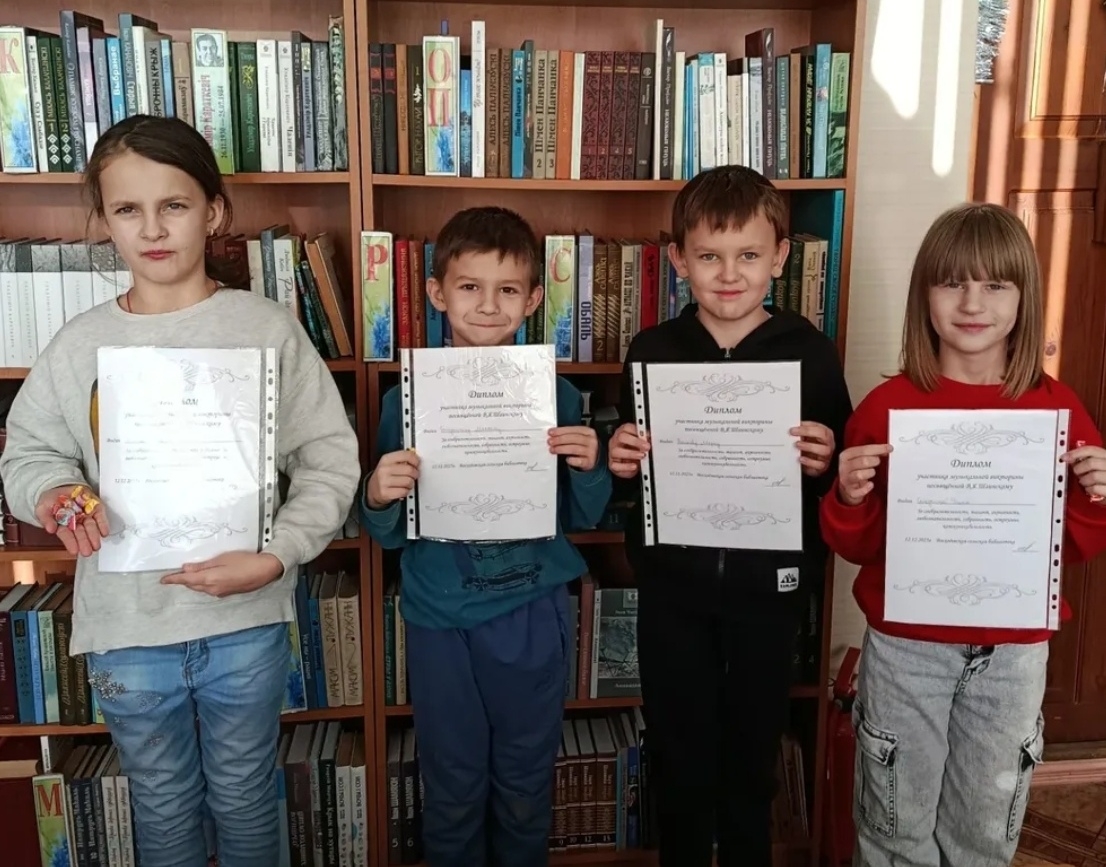 12 декабря в Восходовской сельской библиотеке прошёл музыкальный час «Вместе весело шагать» к 100-летию со дня рождения В.Я.Шаинского советского и российского композитора, пианиста, певца. Школьники познакомились с биографией и творчеством  Владимира Яковлевича, ответили на вопросы викторины «Песни В.Шаинского», посмотрели музыкальные произведения: «В траве сидел кузнечик», «Антошка», «Я играю на гармошке» и разгадали кроссворд по творчеству В.Я.Шаинского. Все участники справилась с задания на отлично, и были отмечены дипломами и сладкими призами.