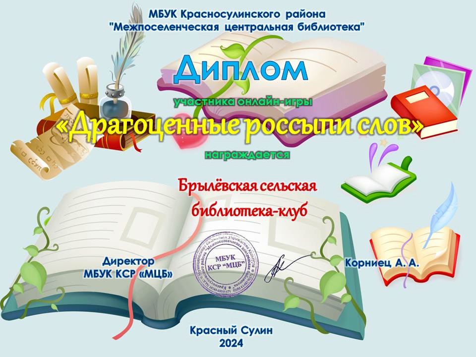 4 января в Брылёвской сельской библиотеке-клубе прошла литературная игра «Собиратель сказок», приуроченная к 240-летию со дня рождения известного немецкого писателя, философа, библиотекаря Якоба Гримма. Всю свою жизнь Якоб Людвиг Карл Гримм посвятил языкознанию, явился основоположником мифологической школы в фольклористике. Вместе со своим младшим братом Вильгельмом собирал, обрабатывал и издавал народные сказки, которые и по сей день являются популярными во всём мире. Участники встречи познакомились с подготовленной книжной выставкой и поучаствовали в игре, в которой нужно было угадать имена персонажей, названия и сюжетные особенности сказок братьев Гримм. Также ребята приняли участие в онлайн-игре «Драгоценные россыпи слов», подготовленной нашими коллегами из Центральной библиотеки г.Красный Сулин и были награждены Дипломом участника. В завершение встречи просмотрели  мультфильм «Госпожа Метелица», созданный по сказке братьев Гримм.