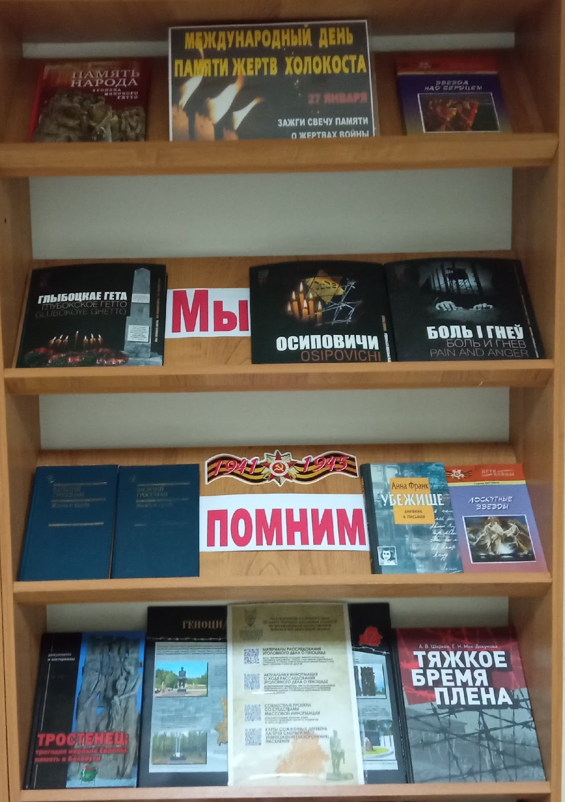 27 января библиотекарь Маховской сельской библиотеки совместно с педагогами ГУО «Маховкая средняя школа» для учащихся младших классов провели кинолекторий «Холокост – память поколений». С помощью документального фильма, школьники познакомились с историей Холокоста, увидели весь ужас испытаний, выпавших на долю взрослых и детей в лагерях смерти: Освенцим, Бухенвальд, Дахау и др. Послушали исповеди «выживших», а также высказывали свои мысли, задавали вопросы и делились впечатлениями. В библиотеке к памятной дате оформлена книжная выставка «Международный день памяти жертв Холокоста».